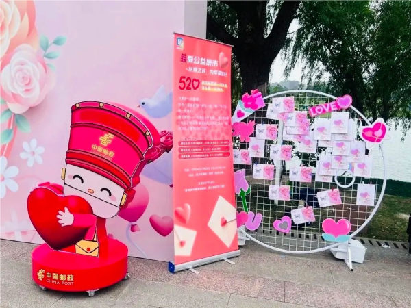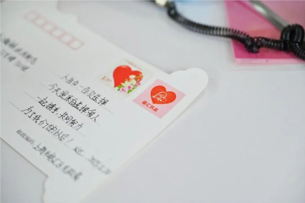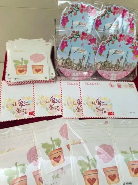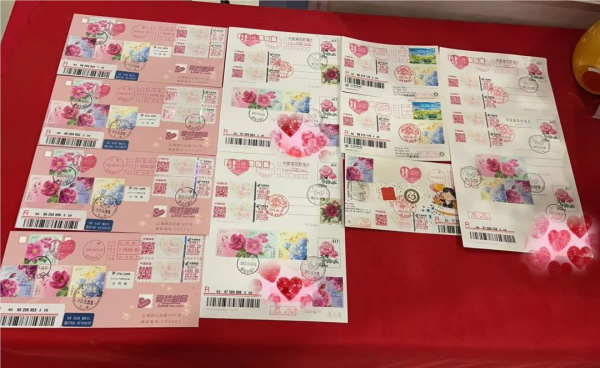 虹口邮政爱情邮局在当天发行“甜蜜告白,为爱出发”邮资机戳,并同步开展“让爱生花”实地寄活动,一封封散发着淡淡玫瑰香气的祝福通过爱情邮局送到大家手中。