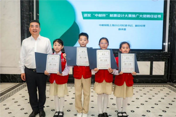 △中邮保险上海分公司纪委书记、副总经理薛承景为“小先生”讲解团成员颁发“中邮杯”邮票设计大赛推广大使聘任证书,鼓励他们积极参与到邮政文化的推广中来,成为文化传承的小使者。