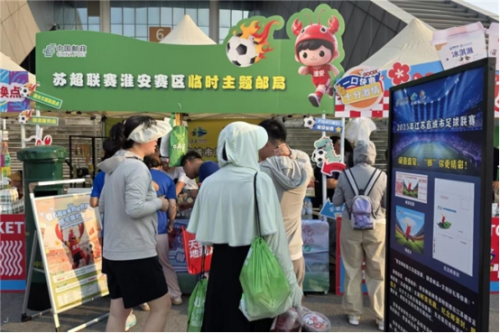 锁定主场,延伸服务半径。淮安邮政充分发挥主场优势,成功争取多个现场助威名额,在全市范围内策划开展“邮我来助威,一钳定胜负”系列主题活动。在邮政网点设立“苏超助威区”,为市民提供赛事直播观看、文创产品领取等沉浸式互动体验,有效延伸了服务触角。
