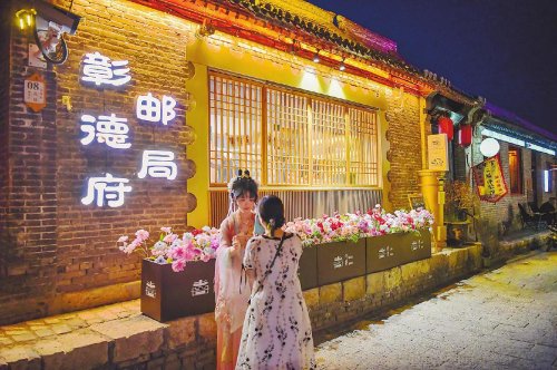 夜幕下的彰德府主题邮局流光溢彩。