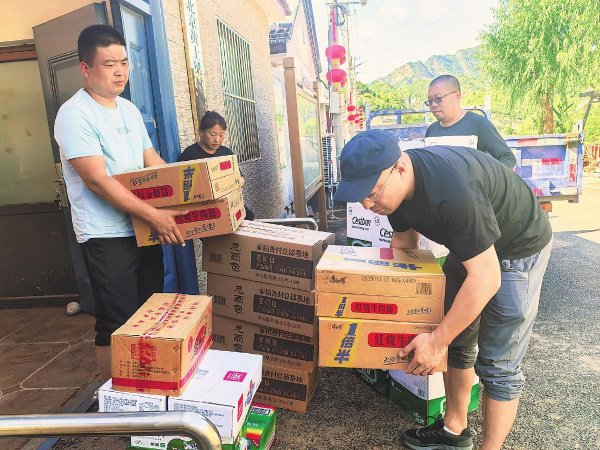 救灾物资送到灾区后,投递员协助搬运、分发。