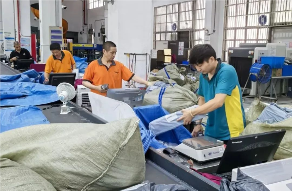 (国际业务分公司现场工作人员扫码、摆件、紧盯屏幕,确保邮件信息录入无误)