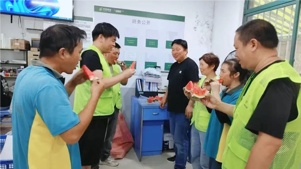 (奉贤邮政一线员工收班后吃西瓜解暑)