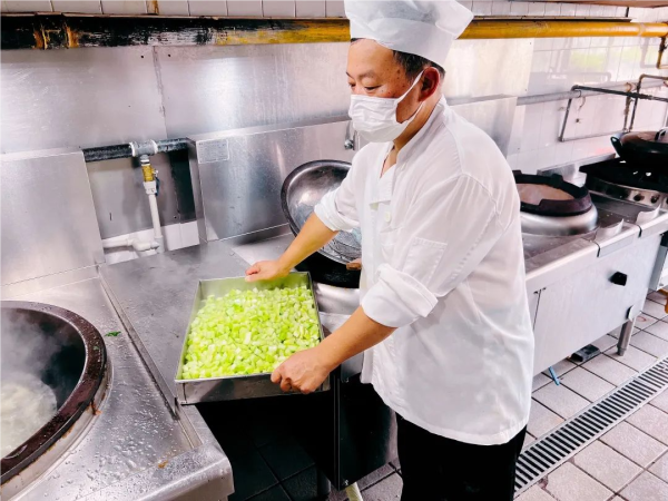 为了给奋战在生产一线的员工做好充足的后勤保障,餐饮中心全体工作人员坚守岗位,用实际行动诠释着责任与担当。烹饪区内,炉灶升腾的热气与室外的高温交织,厨师们在40℃以上的灶台前精心烹制每一道菜肴,并通过食品溯源管理、生熟分开、烧熟煮透、餐盘用具高温热力消毒等一系列有效手段,全力守护大家的“舌尖安全”和“用餐幸福” 。