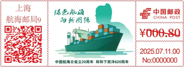为传承航海文化,弘扬丝路精神,上海航海邮局特发行《绿色航海向新图强》CX51型邮资机戳1枚。