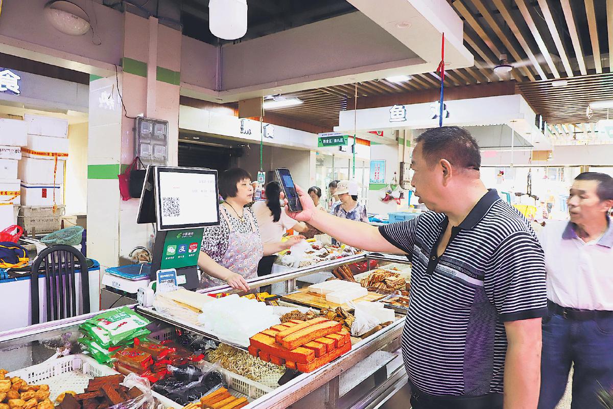 居民在易赖街AI智慧农贸市场用手机支付。□李无我 郭育琳 摄