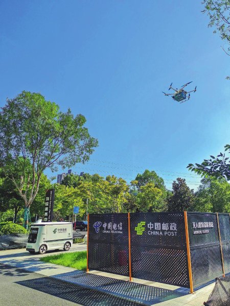 8月20日,在安徽省合肥市政务中心中国邮政无人机物流枢纽站,无人机启程配送无人车送来的邮件。