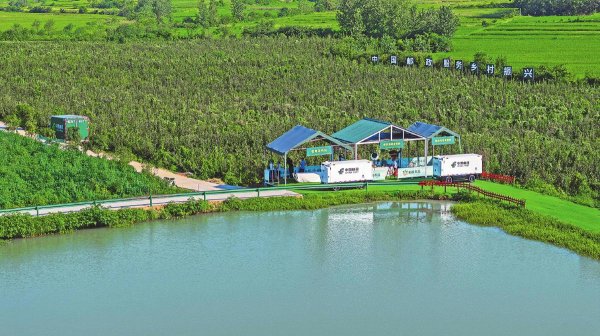 8月21日,在安徽省六安市霍邱县元圩瓜果种植专业合作社,邮政无人车在拉运邮政电商直播卖出的秋月梨(无人机照片)。