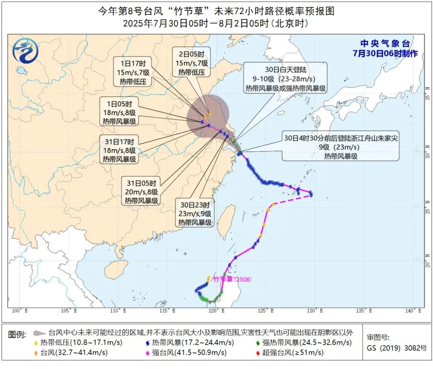 早晨7时其位于距离浙江省舟山市偏东方向约20公里,就是北纬30.0度、东经122.4度,中心附近最大风力有9级(23米/秒),中心最低气压为975百帕,七级风圈半径东北方向300公里;东南方向250公里;西南方向100公里;西北方向150公里。“竹节草”将以每小时10-15公里的速度向北偏西方向移动,强度变化不大。