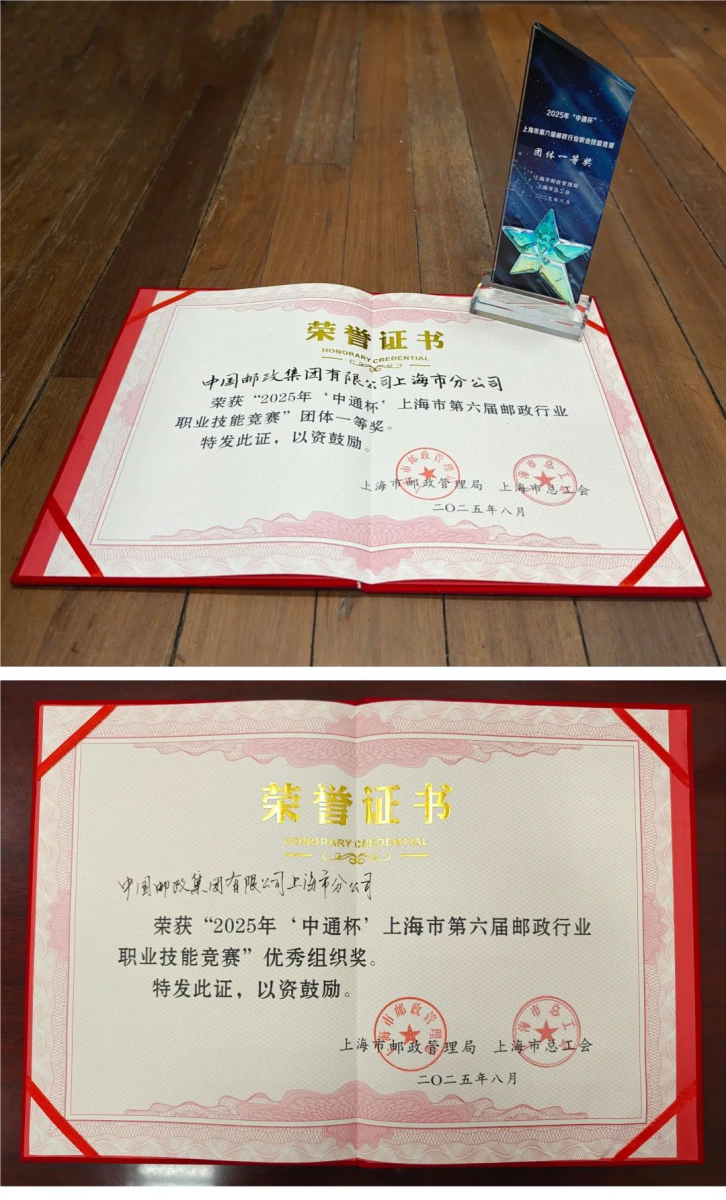 在8月24日圆满落幕的2025年“中通杯”上海市第六届邮政行业职业技能竞赛中,上海市分公司代表队表现优异,夺得团体一等奖和优秀组织奖。
