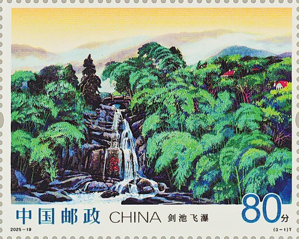 第一枚“剑池飞瀑”(见图),叙述了莫干山的古老传说。邮票画面聚焦剑池瀑布自苍崖飞泻而下的刹那,与周边环绕的茂林翠柏、苍岩石壁共同讲述干将、莫邪铸剑的传奇故事。第二枚“群墅点翠”,呈现了莫干山的建筑风貌。此枚邮票将掩映在翠竹间众多风格各异的别墅尽收眼底,别墅群落依山就势,错落层叠,红瓦青砖与修竹劲松相映成趣。第三枚“旭光云海”,描绘了莫干山的日出景象。该枚邮票定格了莫干山旭日东升的壮丽景象,旭光台作为莫干山观赏日出的绝佳观景台,将天地交辉的盛景尽收眼底。
