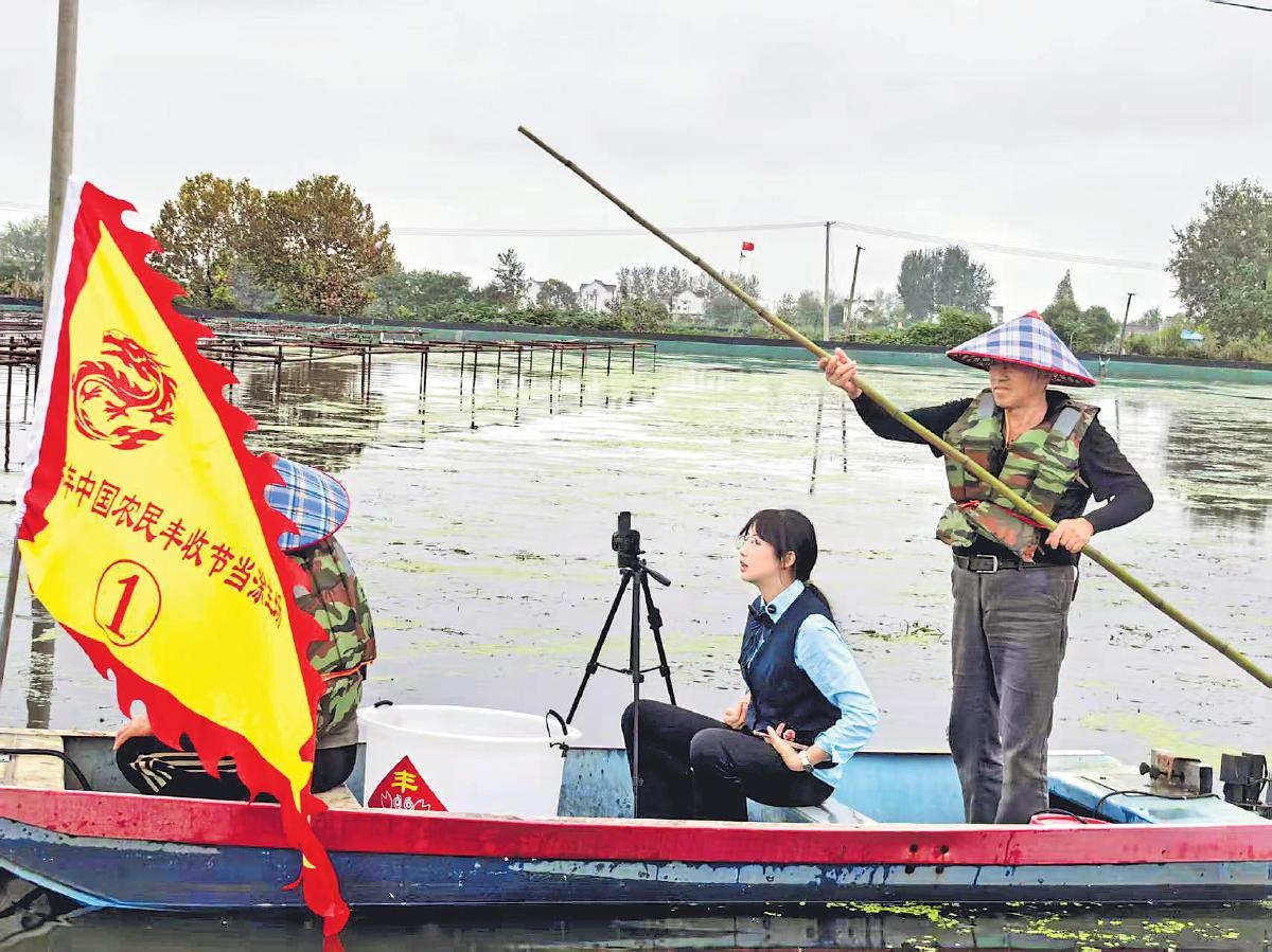 邮政在蟹塘边开展直播,助力螃蟹销售。