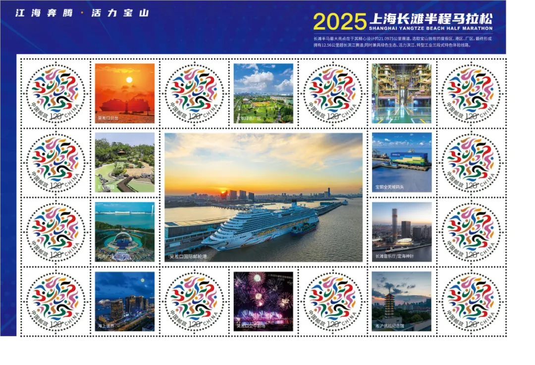 上海市宝山区邮政分公司携手上海市宝山区体育局、上海宝山文化旅游产业发展有限公司推出首款融合体育赛事激情、地域人文底蕴、健康环保理念与滨江风景美学的个性化邮票纪念邮折,以“让赛道讲述城市故事”为核心设计理念,将“江海奔腾,活力宝山”的赛道叙事与跑者的拼搏瞬间,凝萃成可触摸、可珍藏、可传递的“国家名片”。