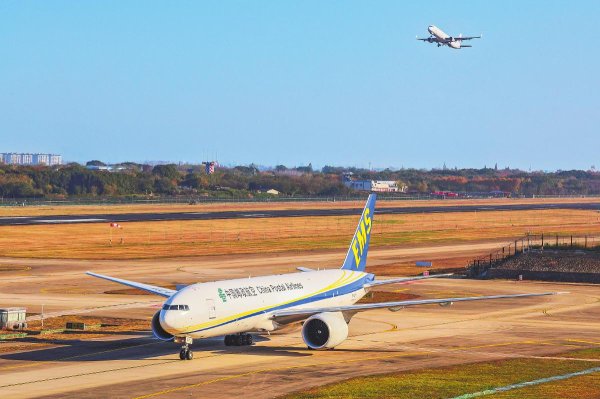 11月18日8:30,中国邮政航空波音777F全货机满载邮货自卢森堡落地南京禄口国际机场后,向邮政自管机坪滑行。