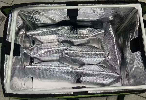 △出发前,投递员给每件牛奶装配冰袋,并放入保温箱中