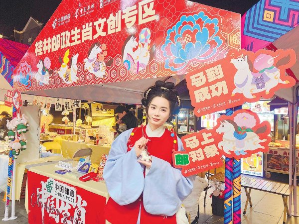桂林邮政在集市上搭建展位,推出多款特色文创产品,包括桂林山水主题明信片和丙午马年生肖主题摆件、钥匙扣以及融合桂林地标元素的冰箱贴等,巧妙地将桂林记忆转化为可携带、可邮寄的伴手礼,深受市民和游客喜爱。此外,该分公司精心布置的马年主题标语打卡板也吸引众多市民、游客驻足拍照。“集市上的邮政文创让人眼前一亮,既有本地特色,又充满年味。我买了明信片和生肖摆件,准备寄给外地亲友,让祝福通过邮政传递出去。”市民陈女士表示。