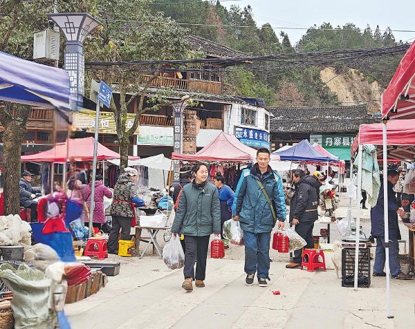 1月20日,贵州省丹寨县排调镇乡场里,邮政“云上集市”工作人员拎着满满几袋年货,准备打包寄给在他乡务工的乡亲。 □韩静桦 摄