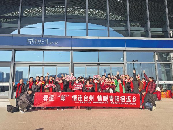 2月9日,安徽省青阳县邮政分公司联合县人社局,在浙江台州高铁站免费接务工老乡返乡。 □宁婷 摄