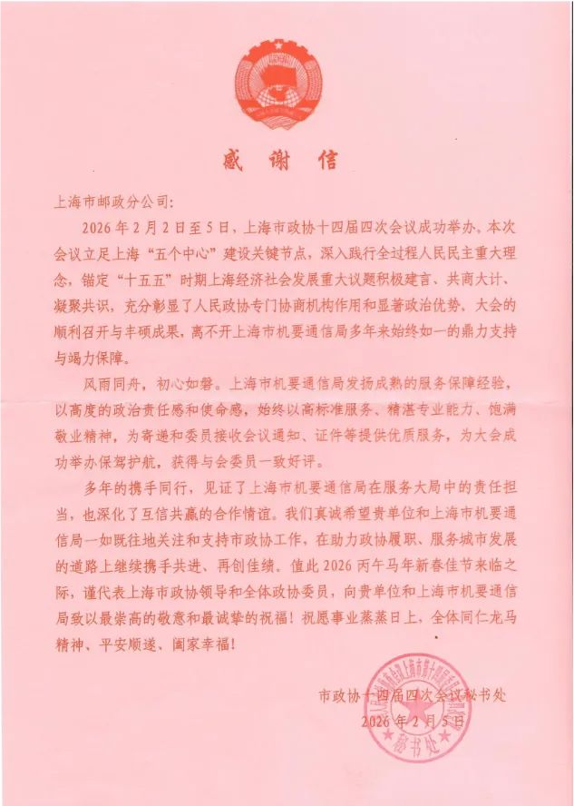 △上海市人大常委会办公厅、市政协十四届四次会议秘书处分别发来感谢信,对市分公司在大会服务保障、机要通信局在文件寄送等工作中提供的专业高效服务表示感谢。