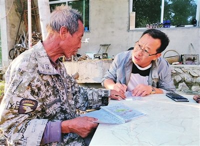 郝军(右)向有经验的村民请教种田经验。□杨明 摄