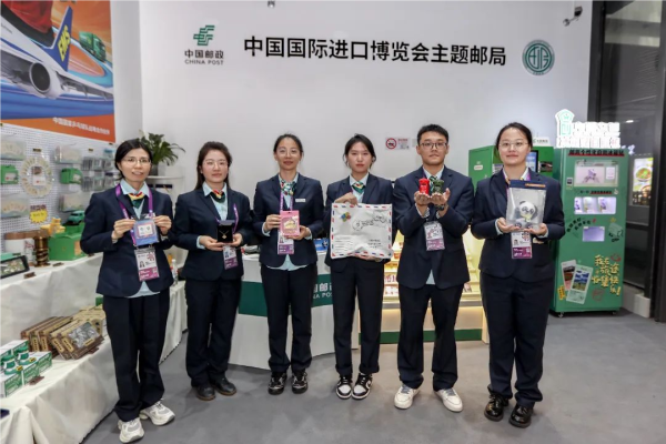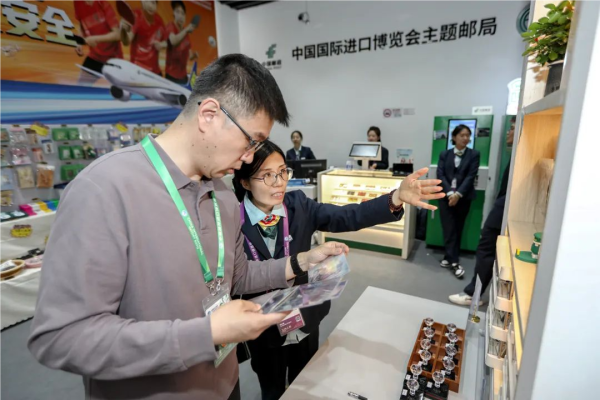 在馆内的进博主题邮局和进博临时邮局可以看到,邮局除了面向所有来宾提供纪念封、加盖进博日戳等传统用邮服务外,各类具有民族元素和中华传统文化元素的文创产品也异常夺人眼球:无论是融合进博元素的邮差托特包、以“四叶草”为灵感并结合掐丝珐琅非遗工艺的系列饰品,还是融合了青浦土布与进宝形象的“进宝土布公仔”,都是今年的“大热款”。